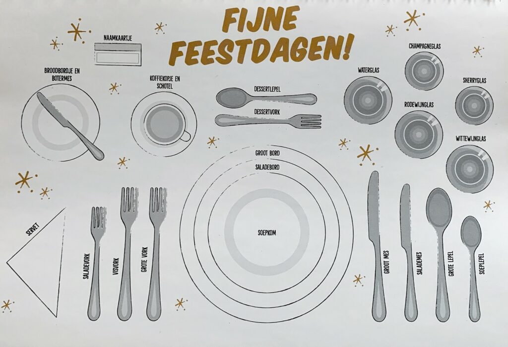 Tafel dekken: mes rechts en vork links. Dat is duidelijk. Maar weet je ook hoe je de tafel dekt voor een groot diner met meerdere gangen, met een glas voor water, witte wijn en rode wijn? Welk glas staat aan de buitenkant? Hier is een spiekbriefje.