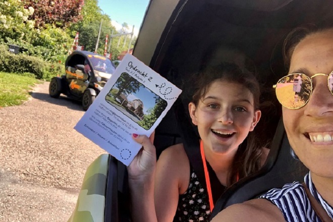 Volwassene voorin, kind achterin. Zijn jullie met z’n 4- en dan 2 auto’s. Je kunt zo vaak uitstappen als je wilt. picknick mee dus. En onderweg kunnen de auto’s contact met elkaar houden via een walkie talkie. Een prachtige taak voor de kids natuurlijk. Spannend!